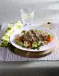 Defrost the peas. Peel, halve or quarter potatoes and cook in boiling salted water for about 20 minutes. Wash the meat, dab dry and cut diagonally into thick strips.
