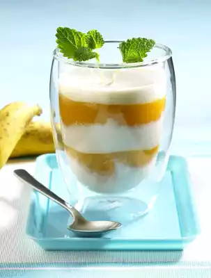 Drain the apricots in a sieve. Puree 6 tablespoons apricot juice and apricots. Peel the bananas and cut them a little bit smaller. Puree yoghurt, milk, sugar and bananas. Carefully fill into glasses in layers and decorate with lemon balm.