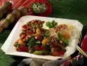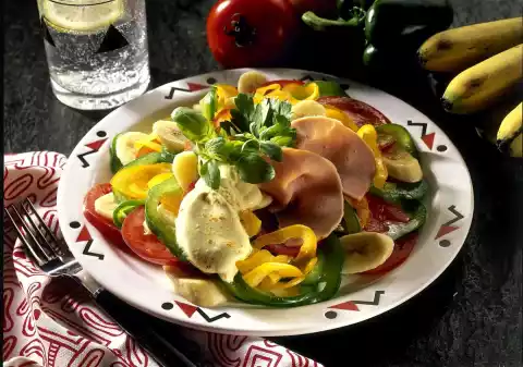 Clean and wash the peppers and tomatoes and cut them into thin rings or slices. Peel banana and cut into diagonal slices. Sprinkle with lemon juice. Stir crème fraîche and yoghurt until smooth and season with curry, salt and pepper.