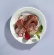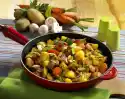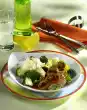 Arrange the prepared ingredients with slices of pork loin and the curry cream on a plate. Serve garnished with parsley, basil or marjoram.