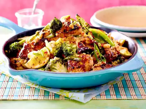 Wash the meat, dab dry and cut into pieces. Mix fish sauce, sesame oil, 3 tablespoons soy sauce, chilli and starch. Mix with the meat.