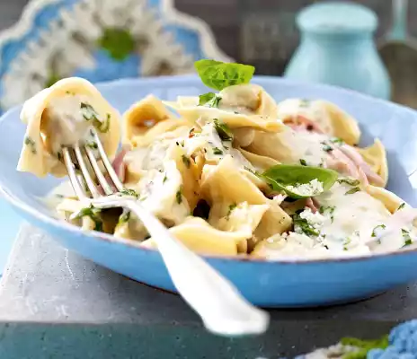 Bring plenty of salt water to the boil in a large pot. Prepare the tortelloni in it according to the instructions on the packet. Then pour into a sieve. Put the tortelloni back into the pot. Add the sauce and mix with the tortelloni.