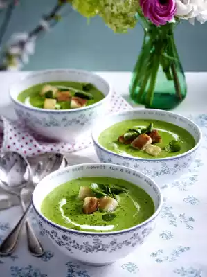 Wash the basil, shake dry, pluck the leaves. Toast bread in the toaster until golden brown, then dice. Puree the soup. Stir in the bresso and season the soup with salt and pepper. Serve with basil and croutons.