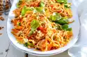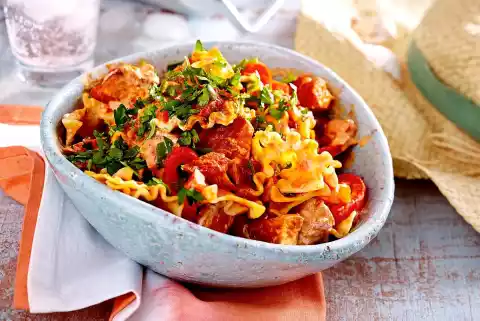 Wash parsley and shake dry, pluck off leaves and chop coarsely. Drain the pasta and put it back into the pot. Season paprika-tomato sauce again and fold into the noodles. Arrange noodles and sprinkle with parsley. Grated cheddar cheese tastes good with it.