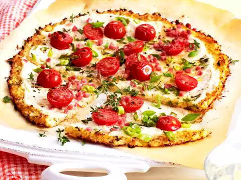 Spread the sour cream on the cauliflower bases and smooth it down. Cover with ham, spring onions and tomatoes and sprinkle with thyme. Bake one after the other in a preheated oven at the same temperature for about 12 minutes.