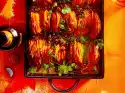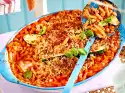 Meanwhile, wash the dill, shake dry and cut the flags finely. Take the tarte flambée out of the oven, cover with salmon and half of the dill. Continue baking at the same temperature for 2-3 minutes. Remove. Serve with caviar and the rest dill.