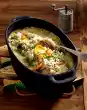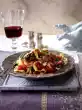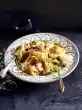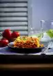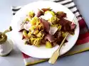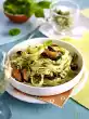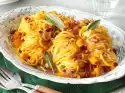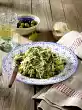Drain the pasta and put it back into the pot. Add 50 g whipped cream and mix well. Arrange meat and noodles on plates, sprinkle with remaining parsley
