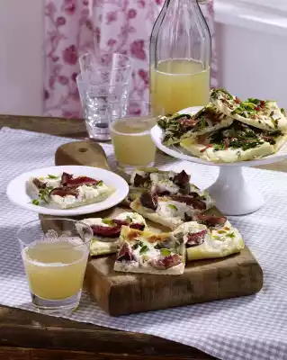 Put the dough in and roll out rectangularly. Spread sour cream on the dough. Spread bacon and spring onions evenly on one half of the dough. Spread the goat cheese with the figs on the remaining half of the dough and sprinkle with thyme. Bake in the preheated oven (electric range: 250 °C/ convection oven: 225 °C/ gas: level 5) for 8-14 minutes on the lower shelf until golden brown. Drizzle the honey over the finished fig and goat cheese. Cut the finished tarte flambée into pieces and serve warm