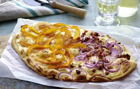 Season with salt and pepper. Cover 1 flat bread half with onions and bacon, the other half with pumpkin, chutney and crumbled cheese.