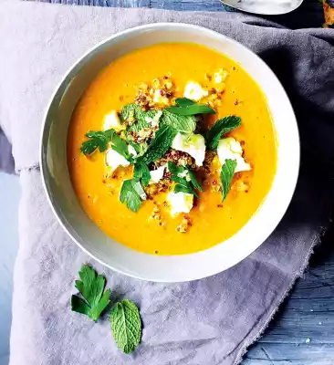 Add 50 ml of boiling water to the couscous and 1 pinch of salt and leave to swell for 4-5 minutes. Chop the nuts and mix in. Wash and chop the herbs. Puree the soup with half the feta. Season to taste with salt, pepper and lemon juice.