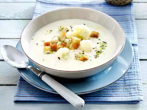 Clean the cauliflower, wash it and cut it into very small florets. Peel onion and garlic, dice finely. 3⁄4 Fry cauliflower, onion and garlic in hot oil. Add 1 l water, broth and lemon juice, bring to the boil.