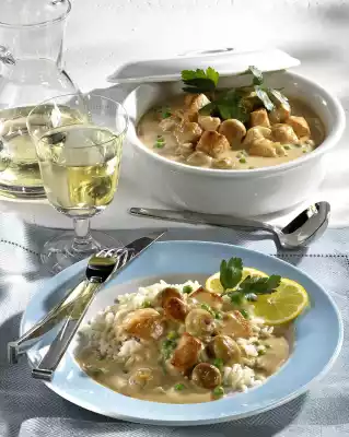 Bring to the boil, stir in the stock and simmer for about 10 minutes. Add the frozen peas and simmer for about 3 minutes. Season ragout with salt, pepper and lemon juice. Serve everything.