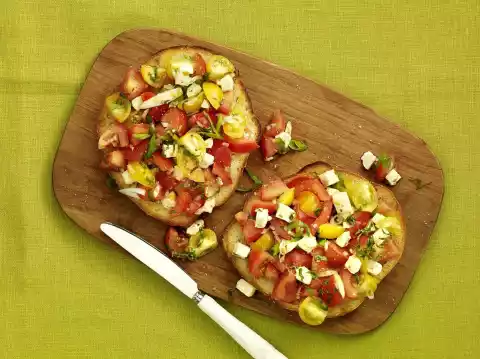 Drain mozzarella and cut into cubes. Wash and clean spring onions and cut them diagonally into rings. Put tomatoes, onion, garlic, basil, spring onions and mozzarella in a bowl. Add vinegar and oil and season with salt, pepper and sugar. Cut flat breads in half horizontally and roast on both sides under the grill of the oven. Spread tomato salad on the breads and serve immediately