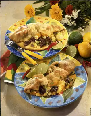 Season to taste with salt, pepper and lemon juice. Mix in apricots and spring onions. Heat the remaining oil. Fry the minced meat and chillies for three to five minutes while turning and season with salt and pepper. Cut the dough into quarters and roll out on a floured work surface to four thin round flat cakes. Spread the minced meat and sauce on top and fold over. Place on a floured baking tray and bake in a preheated oven (electric range: 200 °C/ gas: level 3) for 15 to 20 minutes. Serve garnished with lime and chilli as desired