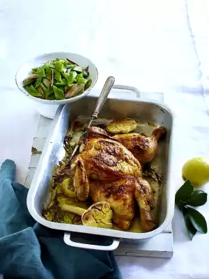 Spread the chicken on both sides with the seasoning butter. Line a baking tray (approx. 42 x 32 cm) with rosemary and lemon slices, spread the chicken out, with the outside facing upwards, and place it on top.