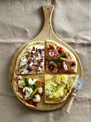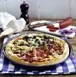 Bake in the preheated oven (electric range: 225 °C/ convection oven: 200 °C/ gas: level 4) for 7-10 minutes. Take out the pizza, cut into pieces, garnish with chervil if necessary and sprinkle with the rest of spring onions, paprika powder or pepper.