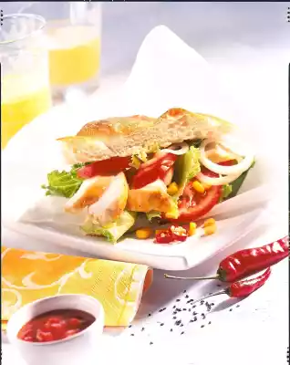 Cut the fillet into slices. Cut the bread open and spread with ketchup. Cover lower half of the bread with lettuce leaves, tomato, onion, corn and chicken. Place the upper half of the bread on top