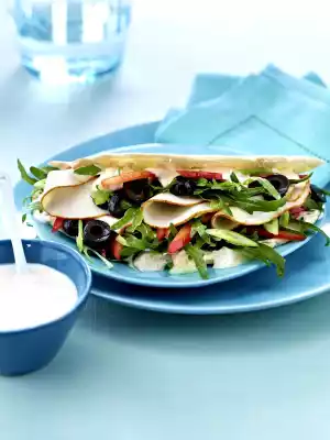 Briefly bake toast pockets in the toaster and cut a pocket into them. Spread the prepared ingredients, sauce and turkey breast in the pockets