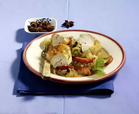 Wash the chicken breast, dab dry and season with salt and pepper. Wash and quarter apples, remove core. Cut the flesh into slices. Mix apple slices, sauerkraut and juniper berries. Put the roasting hose on a baking tray. Pour in sauerkraut mixture.