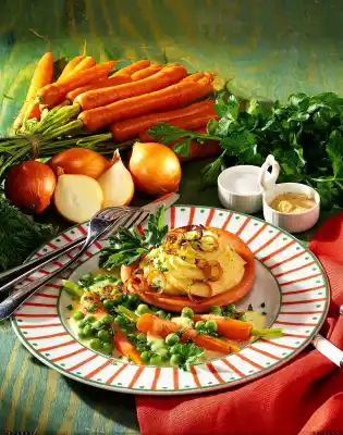 Stir into the hot vegetable water and simmer for 1-2 minutes while stirring. Peel onions and cut into fine rings. Heat the remaining fat in a large pan. Fry slices of sausage and onion for 3-4 minutes while turning. (During this process the sausage slices bend upwards like nests at the edges.) Arrange the sausage slices and vegetables on 4 plates. Put the mashed potatoes in a piping bag with a large star-shaped spout and spray a thick tuff on each sausage slice. Sprinkle with onions and remaining herbs and serve garnished