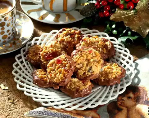 Warm up the chocolate coating again. Dip the Florentine from the underside into the couverture using two forks. Let it dry on a cake rack. Results in about 40 pieces.