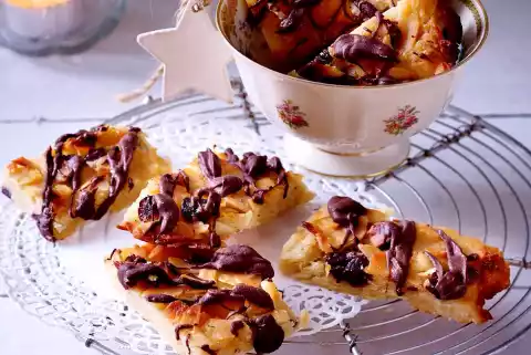 Line a baking tray with baking paper. Pour the almond paste onto the baking tray and spread it out to form a square (approx. 30 x 30 cm) firm and smooth. Bake in a preheated oven (electric cooker: 200 °C/ circulating air: 175 °C/ gas: see manufacturer) for approx. 12 minutes. Take out and let cool down. Carefully pull the Florentine mixture with the baking paper from the baking tray onto the work surface. Cut into small rectangles (approx. 3 x 5 cm) with a sharp knife.