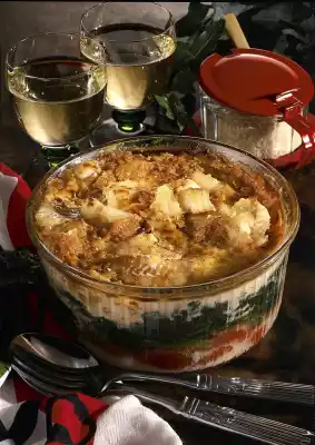 Season to taste with salt, pepper and nutmeg. Pour the sauce over the casserole, sprinkle the remaining Parmesan cheese over it and cook in the preheated oven (electric cooker: 200 °C/ gas: level 3) for about 45 minutes.