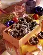 Add bitter almond oil and rum. Stir in eggs one after the other. Mix flour with starch and baking powder, sieve onto the fat-egg mixture and fold in. Gently fold in the fruit mix and almond brittle, except for something for decoration.