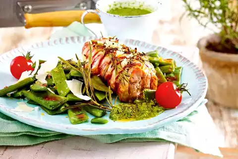 Finely slice the parmesan. Wash the tomatoes. Arrange meat, beans, some pesto and tomatoes. Sprinkle with parmesan. Add the rest of the pesto.