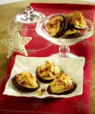 In the meantime chop the cherries into small pieces. Melt 50 g butter, 100 g sugar and honey in a large pan while stirring until the mixture is lightly browned. Mix in the cream and simmer for about 2 minutes. Add almonds and cherries, simmer for another 3 minutes at low heat while stirring. Put the almond mixture as small heaps on the cookies. Put the cookies back into the oven, bake for about 7 minutes. Take out the cookies and let them cool down. Chop the chocolate coating and melt over a warm water bath. Dip the shortcrust pastry bases into the couverture. Leave to dry