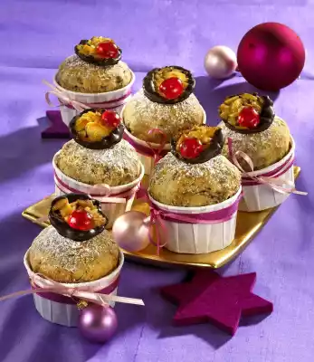 Knead fruit mix, citronate and chocolate into the dough on a work surface generously sprinkled with flour. Form into a roll, divide into 12 pieces and shape into balls. Grease the moulds and dust with flour. Place the balls inside. Leave to rise for 30 minutes. Bake in the preheated oven (electric cooker: 175 °C/ convection oven: 150 °C/ gas: level 2) for about 20 minutes. Leave to rest for a short time, dust with icing sugar and serve decorated with small biscuits