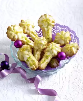 Mix 125 g icing sugar and lemon juice. Spread the biscuits with it, decorate with pistachios and the rest of the lemon peel. Leave to dry.