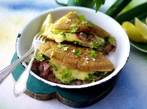 Separating eggs. Mix egg yolks and cream cheese. Beat the egg whites with the whisks of the hand mixer until stiff and fold into the egg yolk cream cheese mixture. Heat 1 tablespoon of oil in each of 2 small coated pans (approx. 18 cm Ø), add half of the egg dough each and smooth it down. Cover the foam omelettes and let them set for about 20 minutes at low heat.