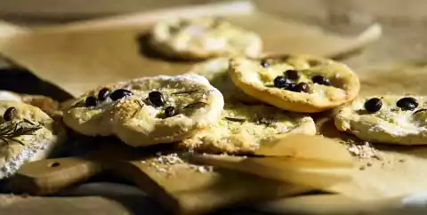 Mix everything with the dough hooks of the hand mixer, then knead with your hands to a smooth dough. Form into a ball and let it rise again for about 30 minutes. Wash the rosemary and remove the needles. Form dough into a roll and divide into about 12 pieces. With floured hands on a lightly floured work surface, shape into flat cakes of about 1/2 cm thickness (about 10 cm Ø). Press in small depressions with your fingers. Brush with remaining oil. Sprinkle with salt, olives and rosemary. Spread the flat cakes on 2 baking trays sprinkled with flour.