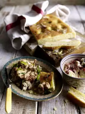 Add salt, approx. 150 ml lukewarm water and 4 tablespoons of olive oil and knead to a smooth dough. Cover the dough and let it rise in a warm place for about 1 hour