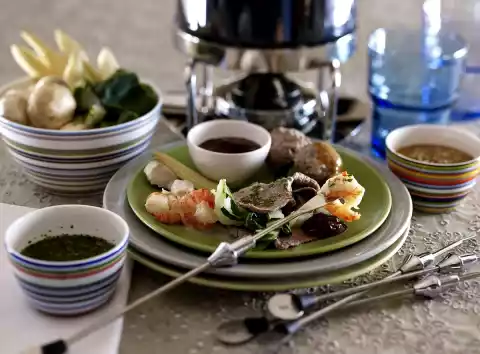 Pour the coconut milk into the fondue pot and bring to the boil. Let it boil on the chef's plate. Pass the dips to the fondue. Place meat, meatballs, fish and vegetables in small fondue sieves in portions and cook in the boiling broth.