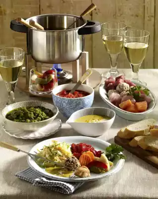 Pour sauces into small bowls and place meat on a plate. Garnish with parsley. Heat the oil in the fondue pot. Fry meat in the hot oil. Add the sauces. Serve with sour vegetables and bread.