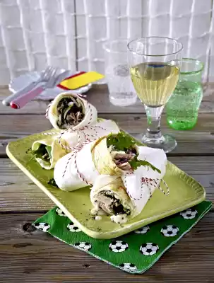 Fold left or right edge 3-4 cm to the middle. Roll up the wrap tightly. Halve the roll. Cut approx. 4 cm wide strips from the parchment and wrap them around the lower end of the wraps. Tie together with gift ribbon or kitchen yarn as desired