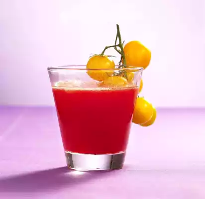 Peel the beetroot and cut it into pieces. Wash, clean and quarter the tomatoes. Press the ingredients through a juicer, collect the juice. Season with salt and cayenne pepper. Top up with iced mineral water. Serve garnished with yellow cherry tomato panicles