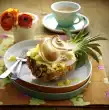 In the meantime, put the dumplings in plenty of boiling salted water and let them simmer in an open pot for about 15 minutes. Wash the grapes, cut them in half and warm them up briefly in the sauce. Arrange dumplings, meat and sauce on plates. Garnish with slices of bacon and parsley