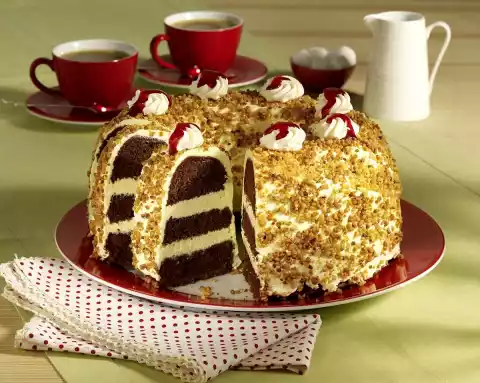 Stir in the eggs one by one. Mix flour, starch, cocoa and baking powder and stir alternately with 50 ml milk into the fat-egg-cream. Grease a ring form (24 cm Ø, 2 litres capacity) well and sprinkle with flour. Pour in the dough, smooth it down and bake in a preheated oven (electric cooker: 175 °C/ convection oven: 150 °C/ gas: level 2) for 35-40 minutes. Let cool slightly on a cake rack. Turn out of the tin and let cool completely. Whisk the butter at room temperature until creamy white (approx. 15 minutes). Warm up the jam and pass through a sieve. Remove 1 tablespoon. Stir the pudding until smooth and stir it into the butter by the spoonful. Cut the cooled base 2 x horizontally. Spread the jam evenly on the lower and middle cake base.