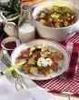 Place the middle base on the lower one. Place the third base as a lid on top. Spread the rest of the cream all around the jam and refrigerate for at least 2 hours. Sprinkle the brittle all around the wreath about 1/2 hour before serving. Whip the cream until stiff by hand or in a shaker and fill into a piping bag with star-shaped spout and decorate the wreath with cream tuffs. Pour some jam over each tuff