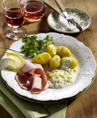 Peel and coarsely chop the eggs and stir into the sauce. Serve the sliced pork sausage with potatoes and sauce. Garnish with remaining herbs and lemon slices.