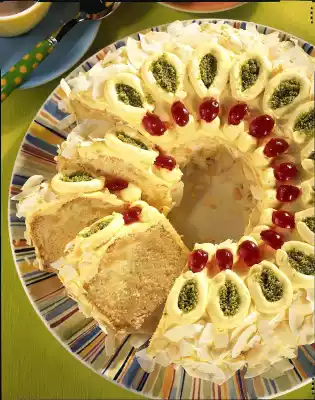 For the cream, beat butter and sugar until fluffy. Stir in the pudding by the spoonful. Coat the wreath with half of the cream. Pour the rest of the cream into a piping bag with a smooth spout. Spray about 18 oval rings and dots on the cake. Fill the rings with pistachios. Press 1/4 cherry onto each of the spots