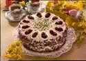 Place the second base on top and spread another quarter of the cream on top. Place the third cake layer on top and spread the rest of the cream all around. Roast the flaked almonds in a pan without fat until golden brown and sprinkle all around the wreath. Chill for about 1 hour. Whip remaining cream until stiff, fill into a piping bag and spray 6 tuffs onto the wreath. Decorate with raspberries and mint to taste. Results in about 20 pieces