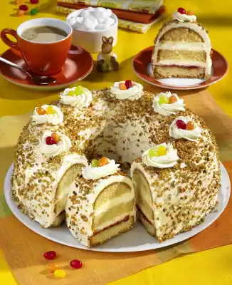 Place the top cake layer on top. Spread the remaining cream on the wreath and sprinkle with brittle. Spray small nests on the wreath. Decorate with jelly or sugar eggs. Keep cold until serving