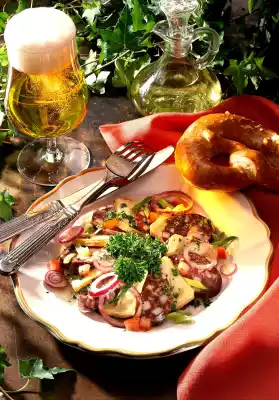 Cut cheese and blood sausage into slices. Arrange fan-shaped on plates, drizzle with the vinaigrette and serve garnished with parsley. Pretzels taste good with it.
