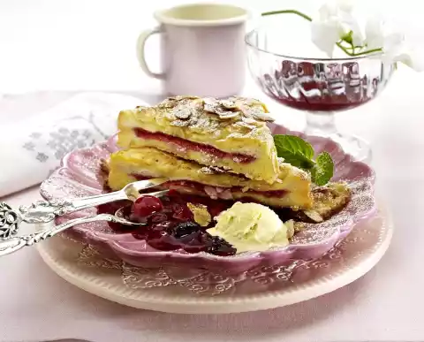 Turn the bread first in the egg milk, then in the flaked almonds. Heat clarified butter in a large pan. Fry the slices of bread on each side until golden brown. Cut the breads diagonally in half, arrange with red fruit jelly and vanilla ice cream. Decorate with mint and thicken with icing sugar