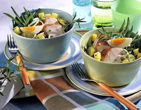 Quench the eggs, let them cool down a bit and peel them. Slice the eggs into six, cut the chicken filet into slices. Season bean salad with salt and pepper, fold in herbs and 2/3 of the ice creams. Put the salad into small bowls and arrange the chicken fillet slices and the remaining ice axes on top.