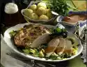 Remove thread from the meat. Remove the beans and serve with meat, fried herbs and garlic. Drizzle meat with roasting mixture and garnish with some savory.